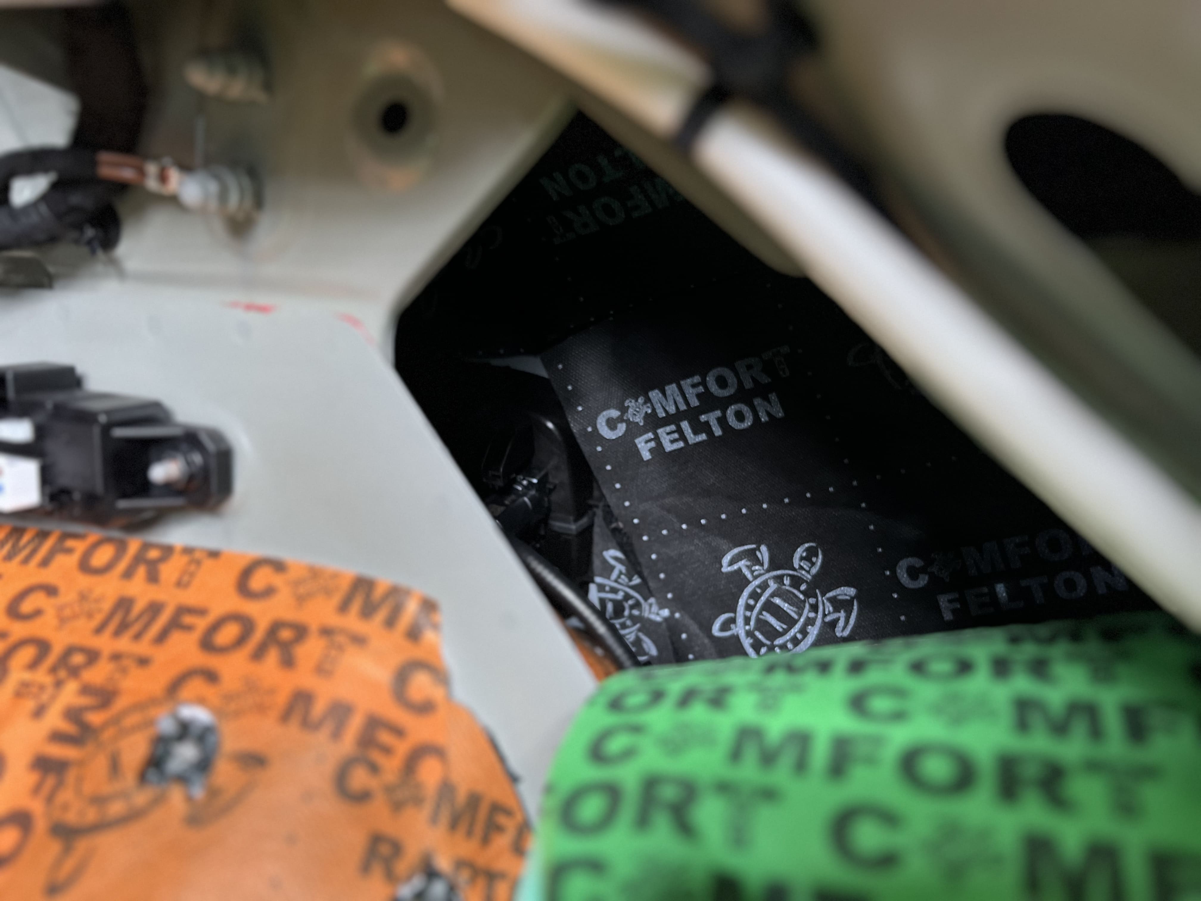 Вторым слоем в районе передних пассажирских сидений уложили Comfort Mat Titan, в остальных местах салона – Comfort Mat Raptor. На стенки багажника нанесли Comfort Mat Felton и Comfort Mat Soundtrap Green. На фото показаны готовые слои Titan, Raptor, Felton и Soundtrap Green, обеспечивающие максимальное поглощение шума. Для закрытия швов и стыков мы использовали контурную ленту, подобранную в тон шумоизоляции, что не только повышает надежность, но и придает эстетичный вид, даже скрытый под ковровым покрытием.