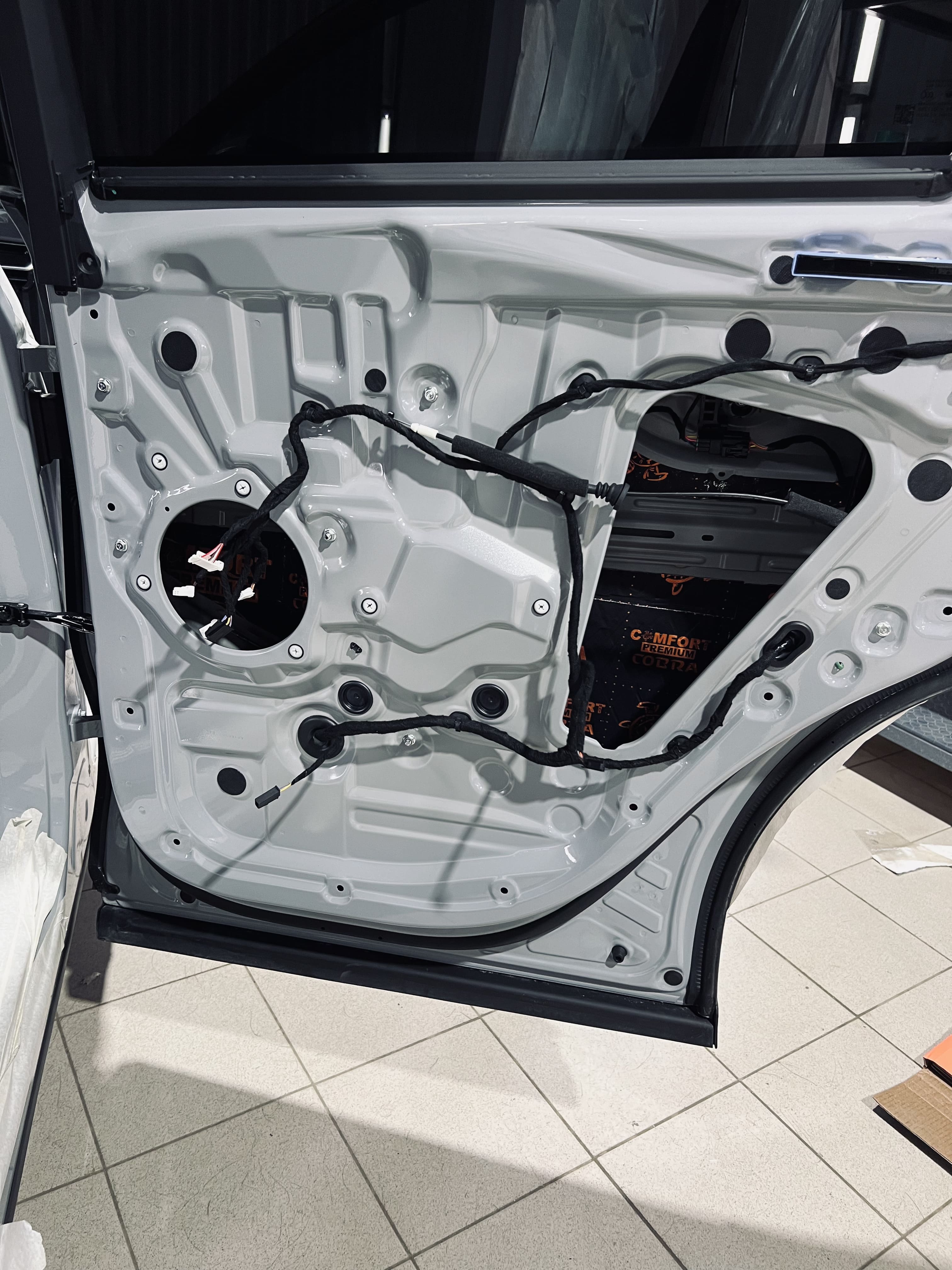 Первым слоем на двери и дверь багажника нанесли виброизоляцию Comfort Mat Dark Cobra. Инновационный шумоизолирующий материал толщиной 2,3 мм, относится к премиальной серии.
