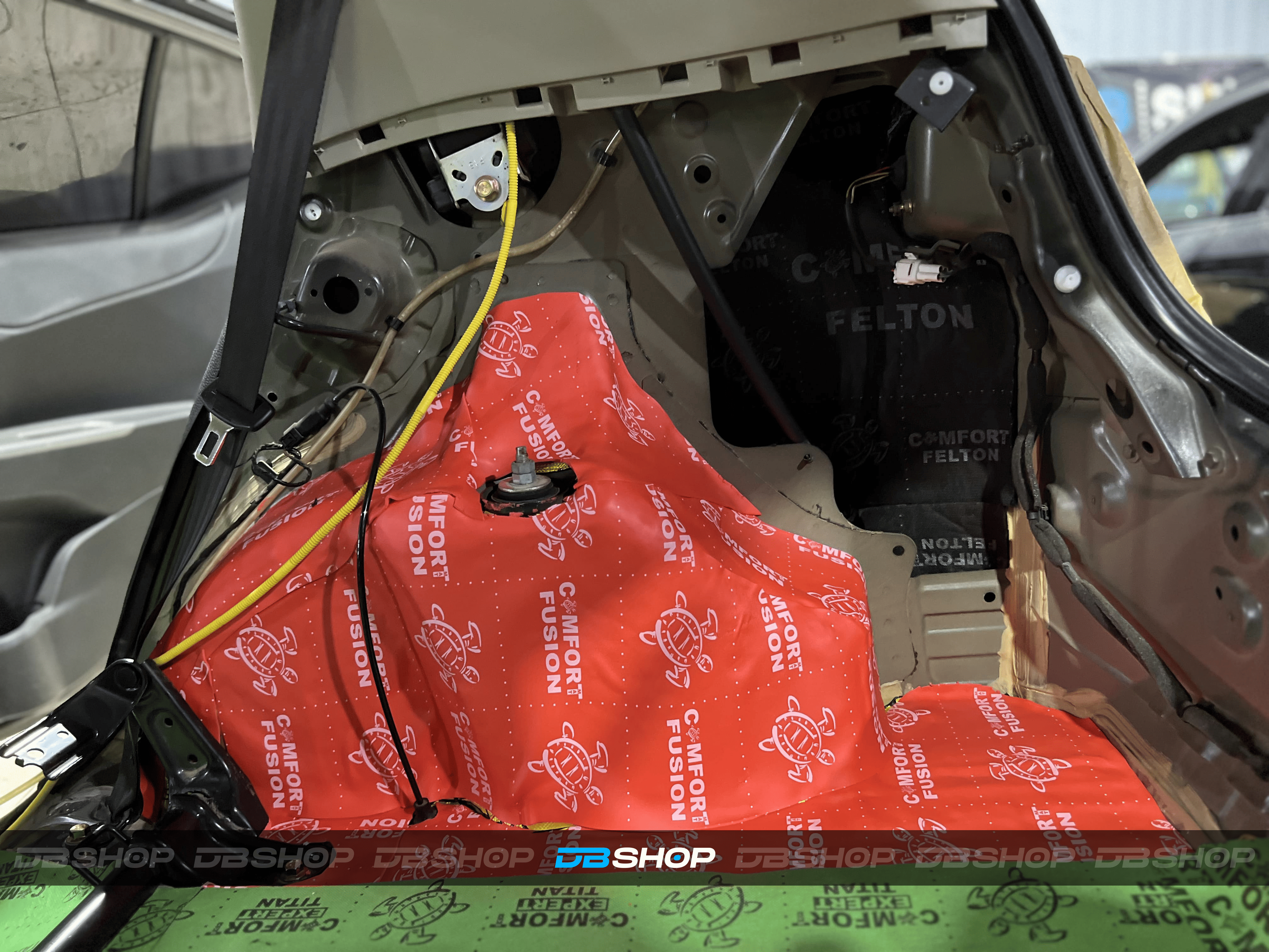 Процесс нанесения второго слоя проводился с максимальной точностью и аккуратностью. На дно салона и дно багажника уложили Comfort Mat Expert Titan, на выступающие части над колесными арками – Comfort Mat Fusion, а на стенки багажника – Comfort Mat Felton. Для закрытия швов и стыков мы использовали контурную ленту, подобранную в тон шумоизоляции, что не только повышает надежность, но и придает эстетичный вид, даже скрытый под ковровым покрытием.