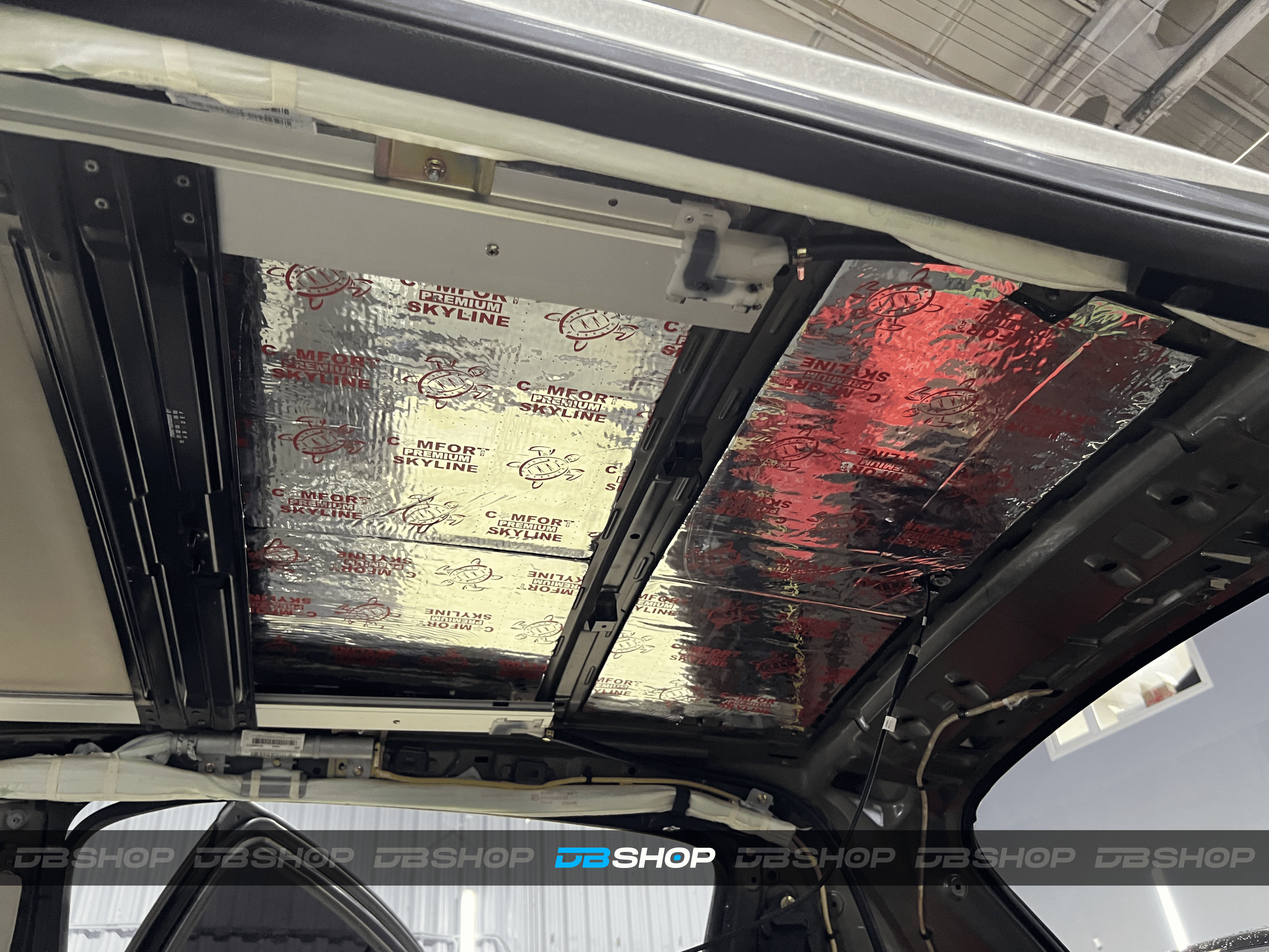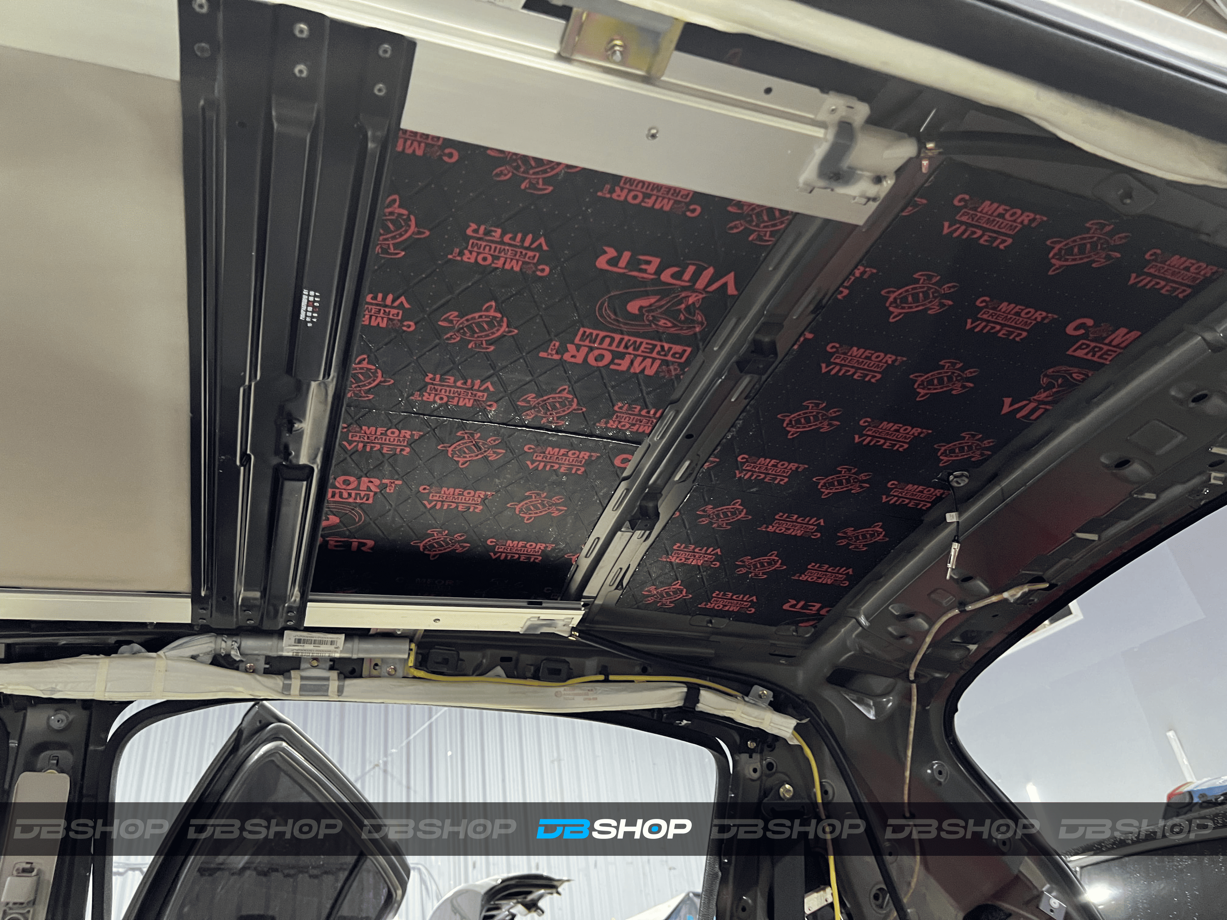 Работа началась с демонтажа потолочной обшивки. Первым слоем на крышу нанесли виброизоляцию Comfort Mat Viper.