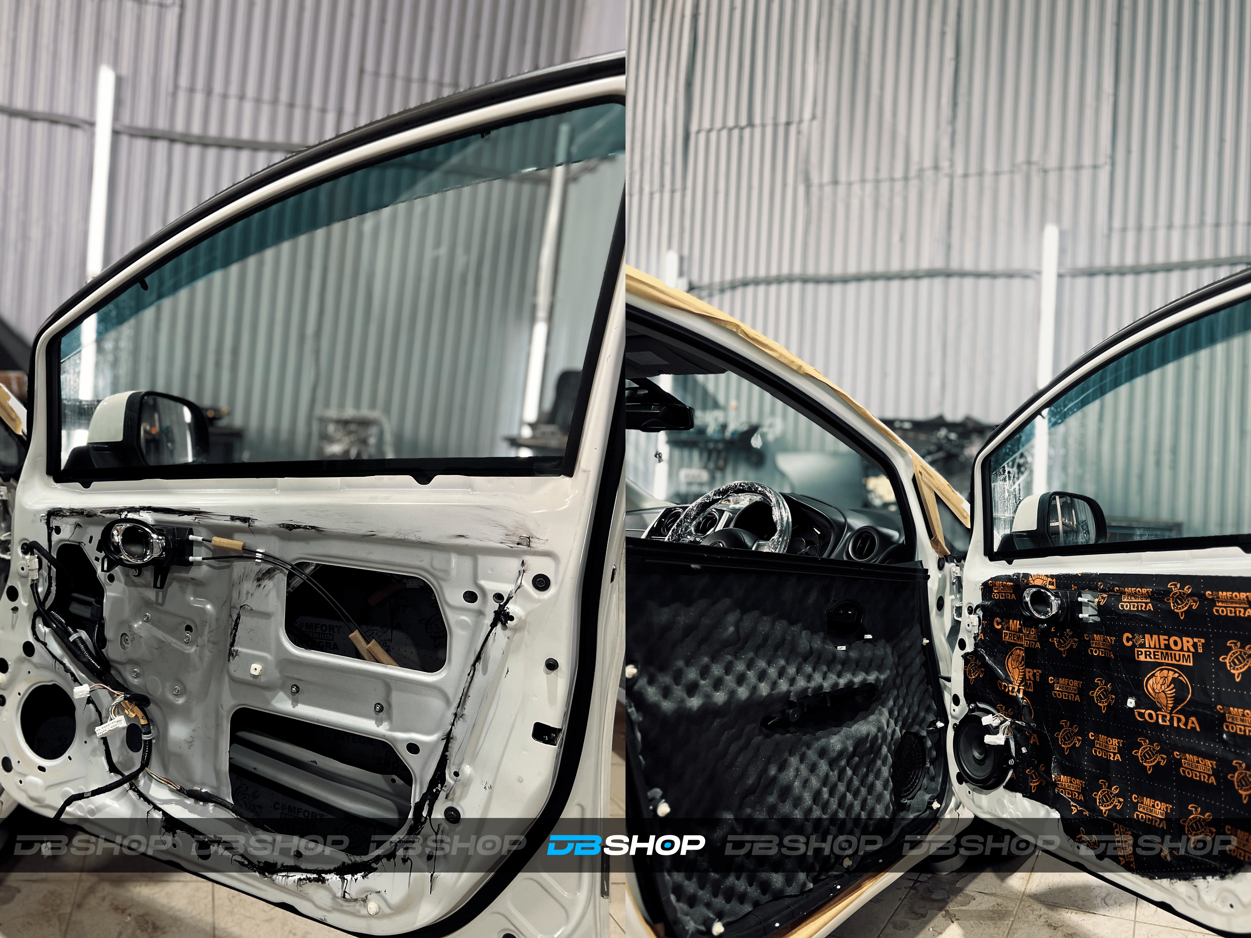 Работа началась с демонтажа дверных карт. Первым слоем на двери и дверь багажника нанесли виброизоляцию Comfort Mat Premium Dark Cobra.