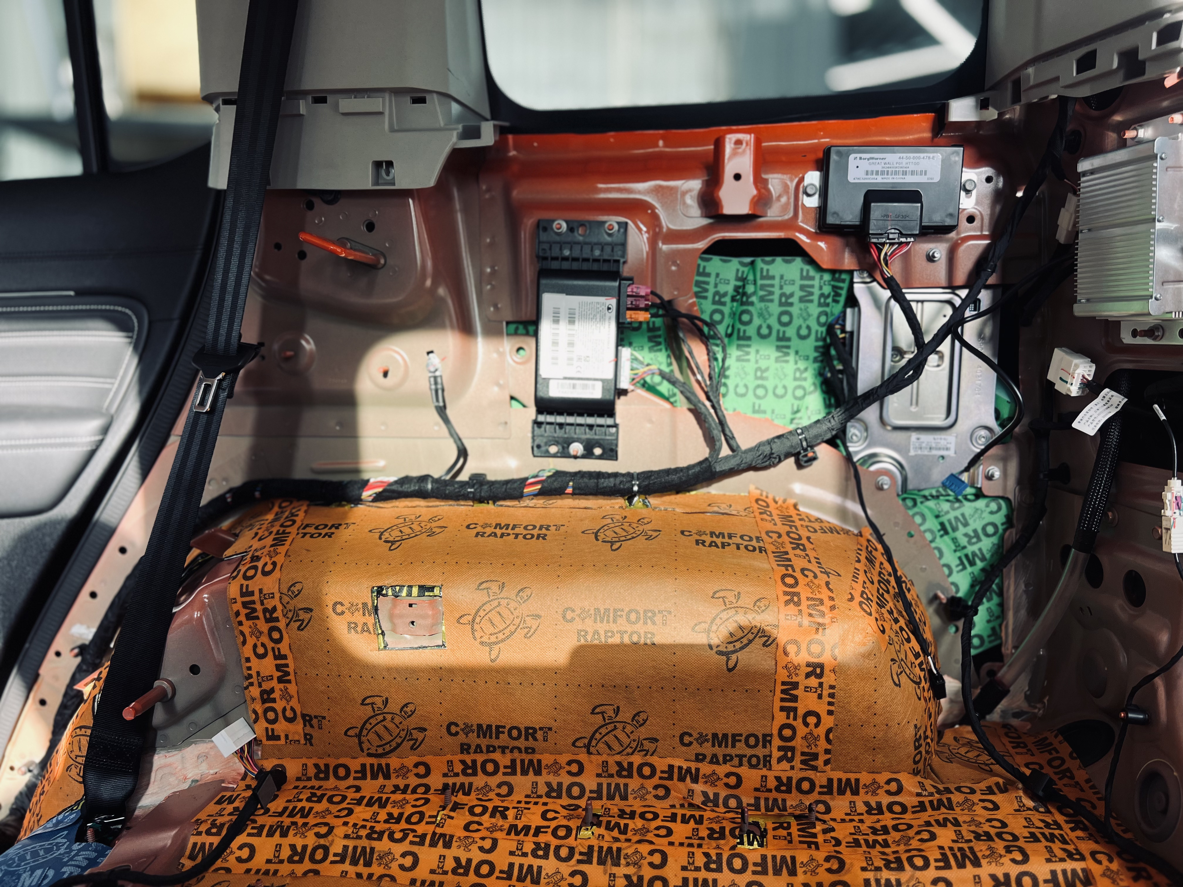 Вторым слоем в салоне применили комбинацию материалов: на дно – Comfort Mat Expert Titan, под задние пассажирские сиденья – Comfort Mat Premium BlockShot, в багажнике на дно и выступающие части над колесными арками – Comfort Mat Raptor, а на стенки – Comfort Mat Soundtrap Green. Для закрытия швов и стыков мы использовали контурную ленту, подобранную в тон шумоизоляции, что не только повышает надежность, но и придает эстетичный вид, даже скрытый под ковровым покрытием.