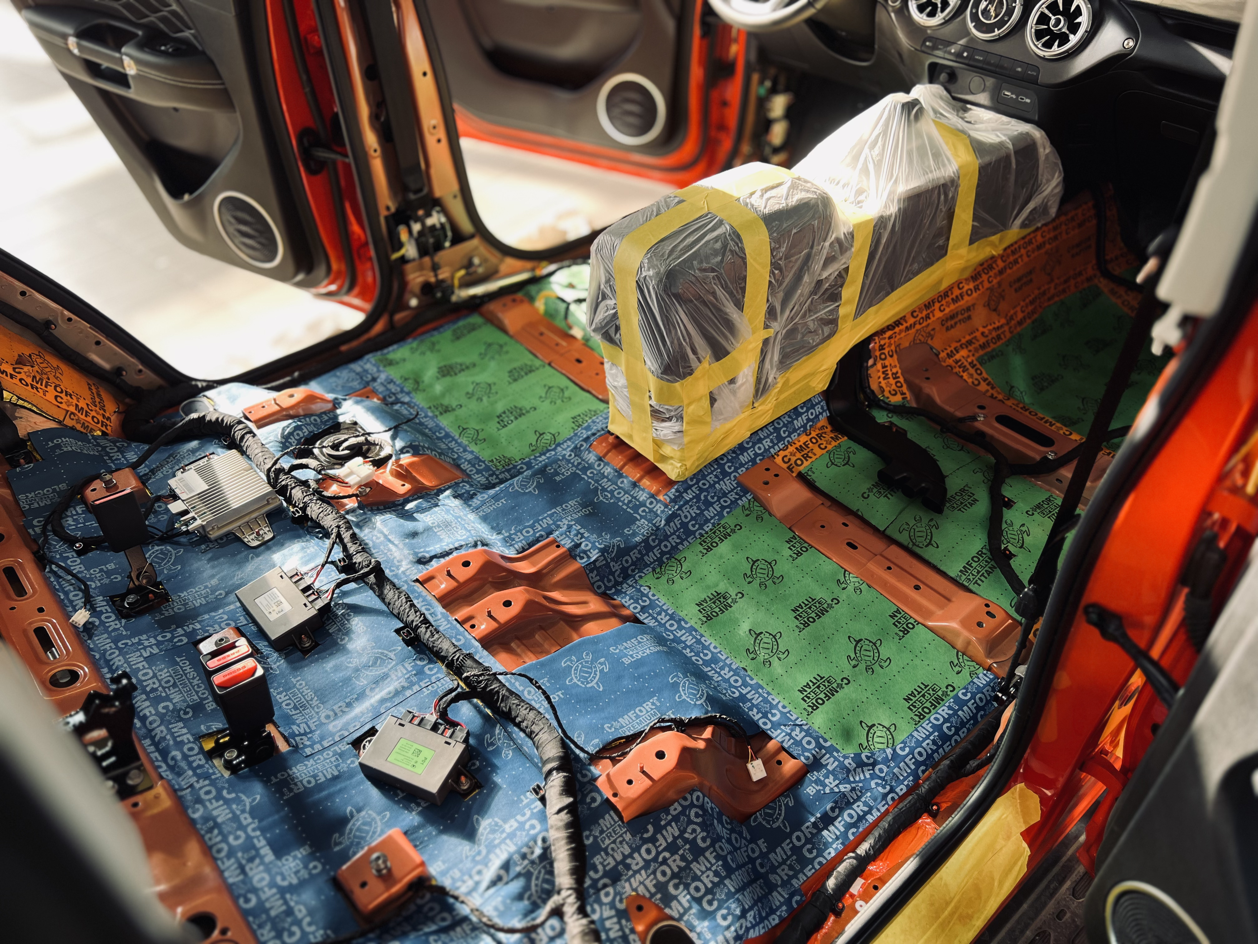 Вторым слоем в салоне применили комбинацию материалов: на дно – Comfort Mat Expert Titan, под задние пассажирские сиденья – Comfort Mat Premium BlockShot, в багажнике на дно и выступающие части над колесными арками – Comfort Mat Raptor, а на стенки – Comfort Mat Soundtrap Green. Для закрытия швов и стыков мы использовали контурную ленту, подобранную в тон шумоизоляции, что не только повышает надежность, но и придает эстетичный вид, даже скрытый под ковровым покрытием.